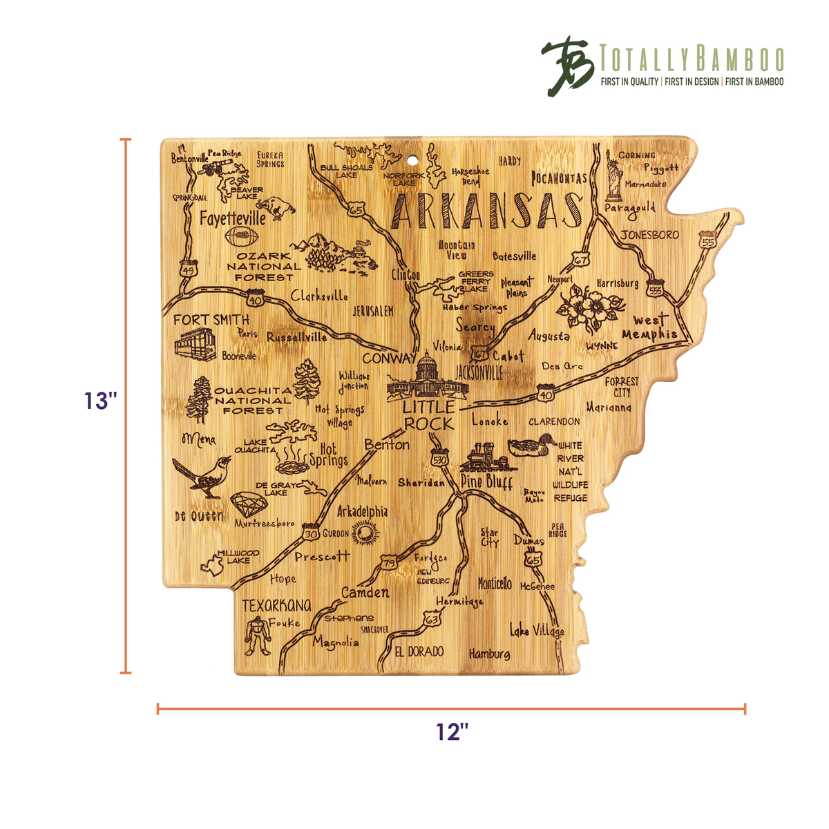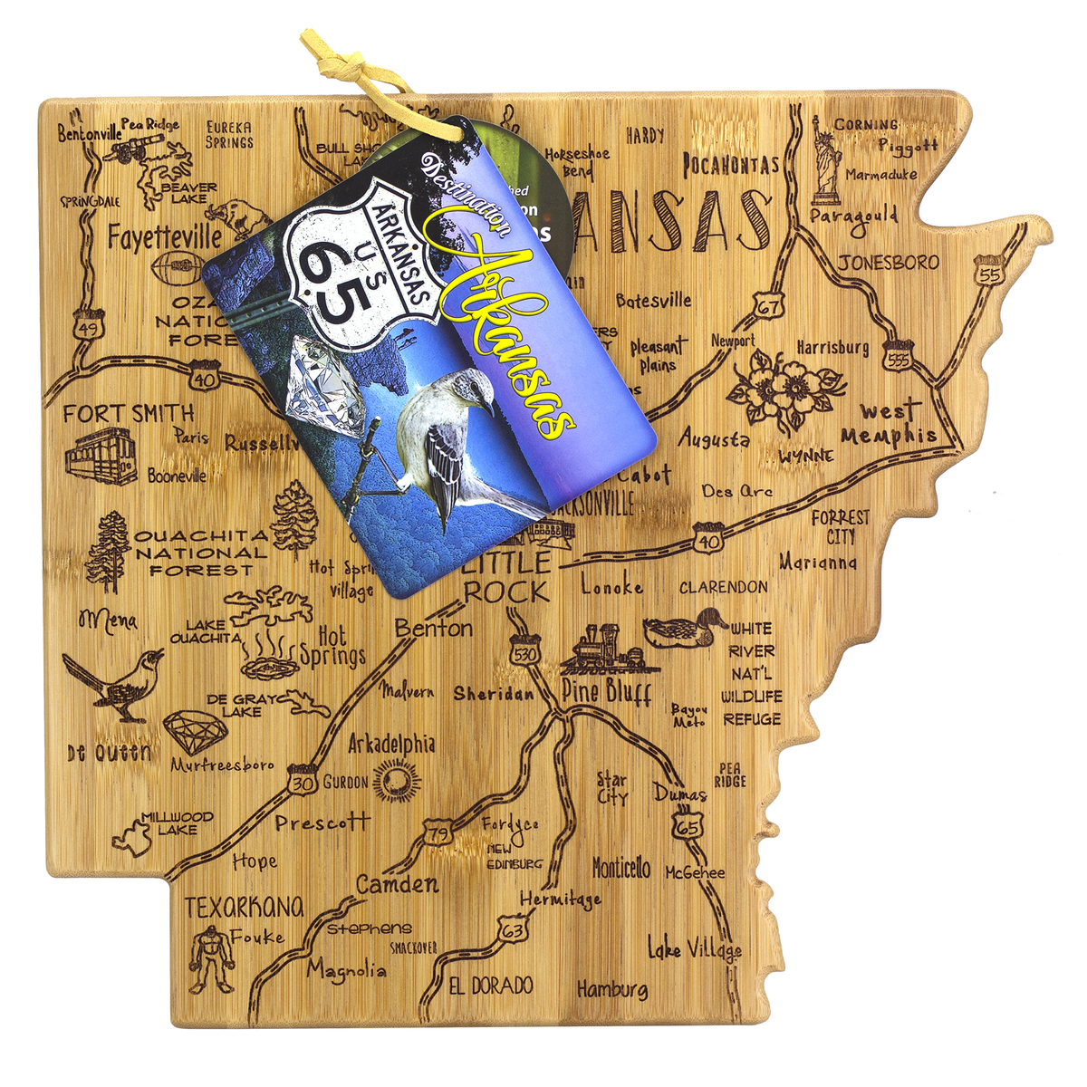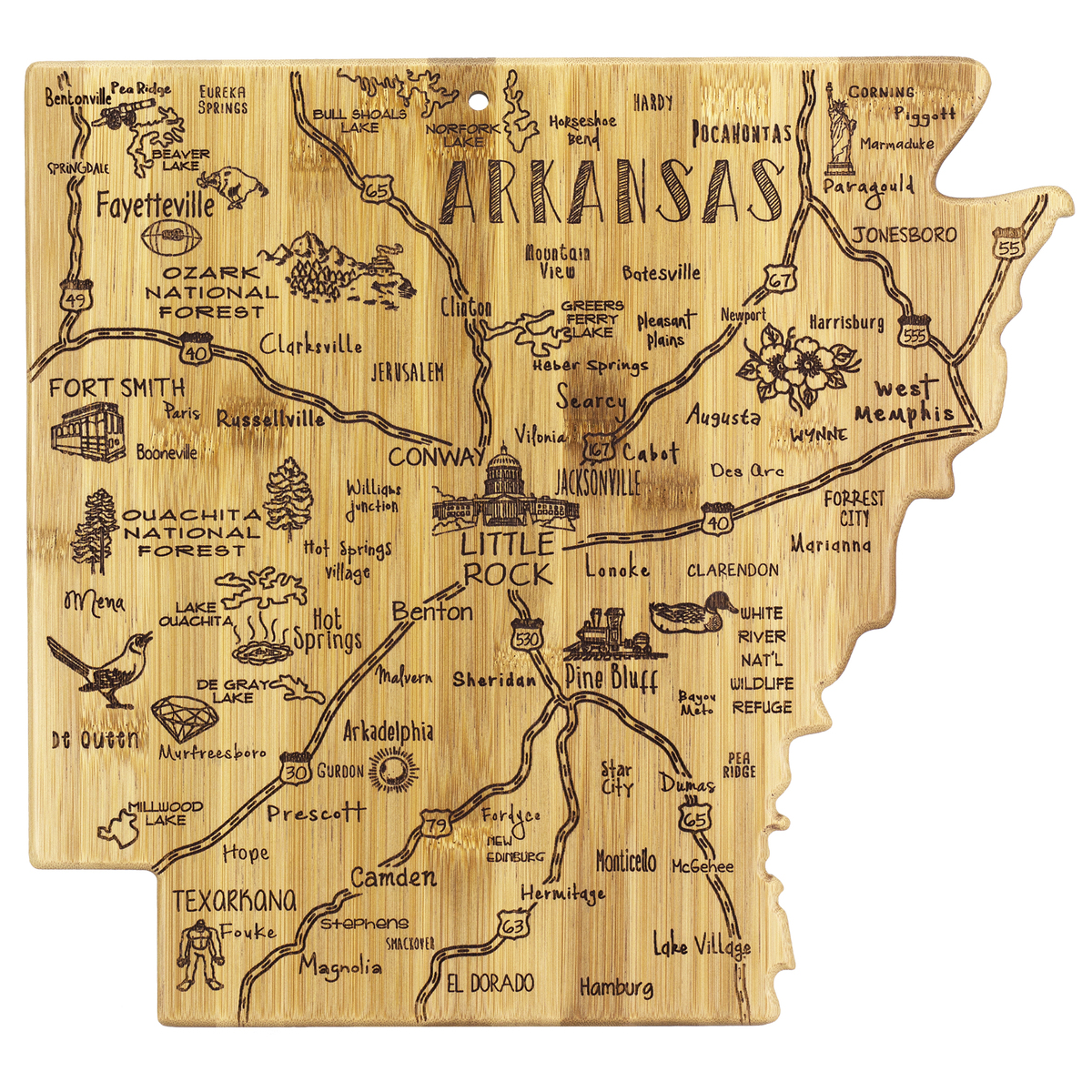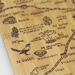 The Destination Series highlights the unique flavor and experiences of every state. The fun, laser-engraved artwork calls out the towns, places and attractions that make each place special. These versatile boards work well as a serving board, a cutting surface or hanging as wall decor with the included hang tie. The line includes every US state, the Hawaiian Islands, Mexico and several Canadian provinces. Boards can be further engraved on the back with a logo.