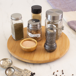 Always have favorite flavorings within reach at the dinner table with the TB Home 10" Bamboo Lazy Susan. This compact Lazy Susan offers space to store favorite condiments, sauces, spices and seasonings at the table— without taking up too much space! It smoothly rotates 360 degrees so every seat can have equal easy access. This convenient Lazy Susan is great as a storage solution too. Keep things neat and tidy in your kitchen cabinets and pantries while having easy access to all of your canned goods, spices, seasonings and more. This Lazy Susan is crafted from sustainable Moso bamboo for a durable yet lightweight construction. If cleanup is needed, the Lazy Susan cleans easily with a light hand washing; do not wash in the dishwasher. Do not put the Lazy Susan in the microwave, refrigerator or oven. The TB Home 10" Bamboo Lazy Susan has a 10 inch diameter and is 1" high.